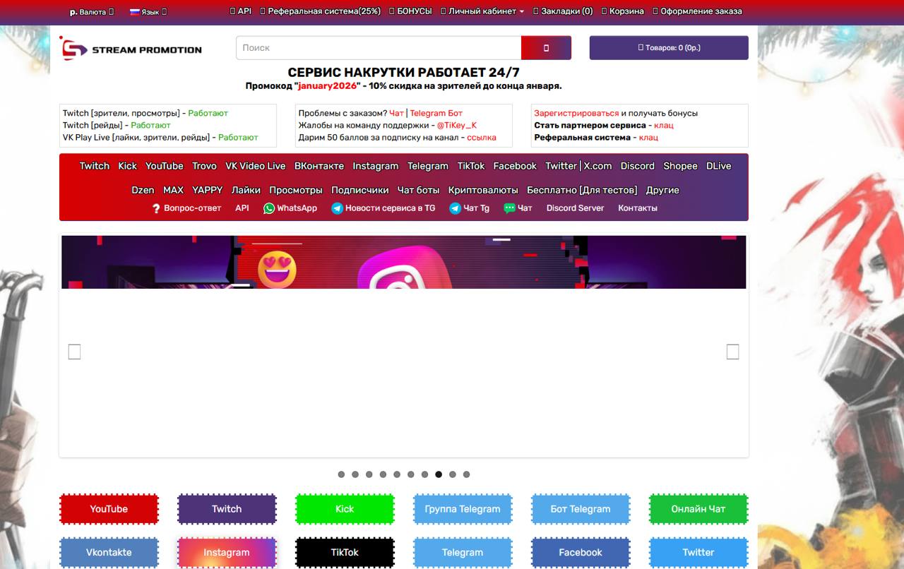 Описание: сервис предлагает стандартные пакеты по накрутке зрителей, фолловеров и лайков. Часто использует модель "посадочных страниц" с промокодами и бонусами для новых клиентов. Акцент в рекламе делается на безопасности и плавности.